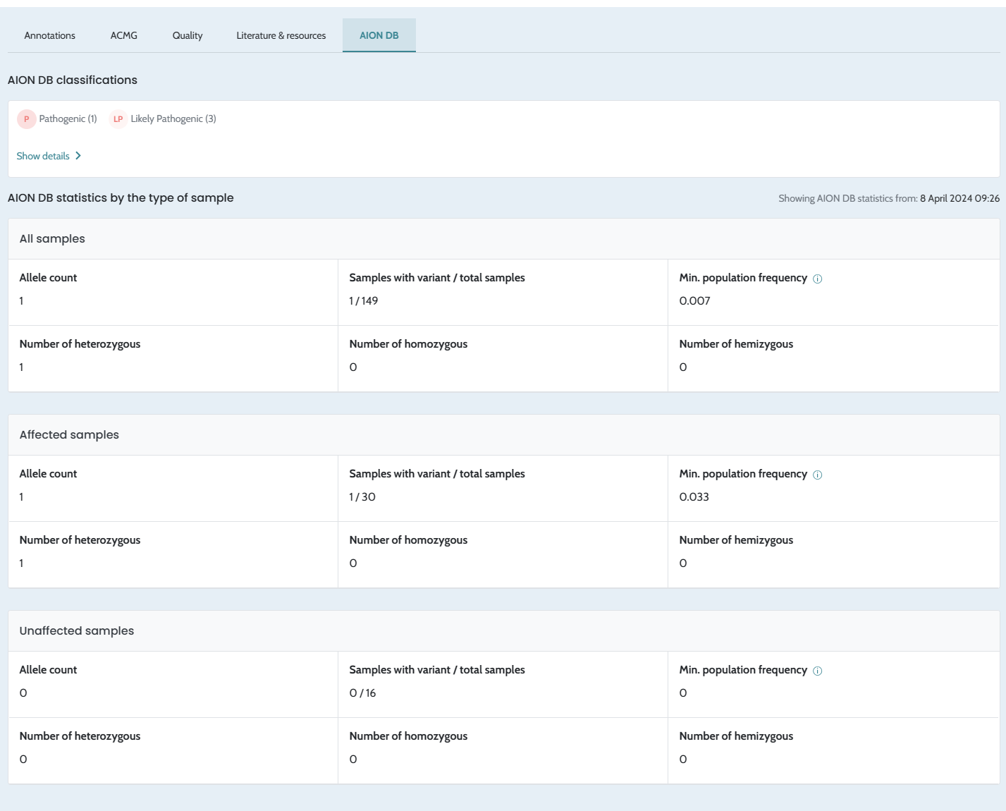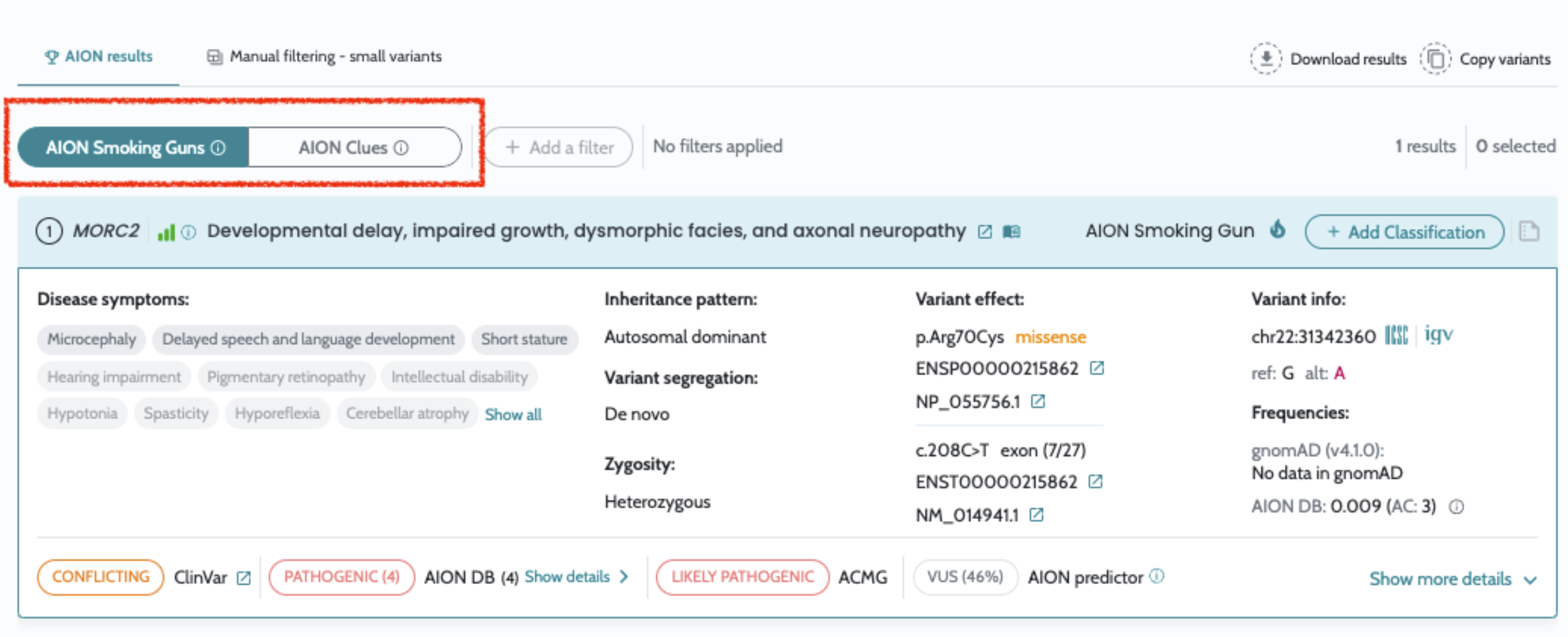 Note: Smoking Guns (SG) results are reported for small variants only. CNVs/SVs are reported exclusively under AION Clues (AC), as SG is not available for CNVs/SVs in AION.