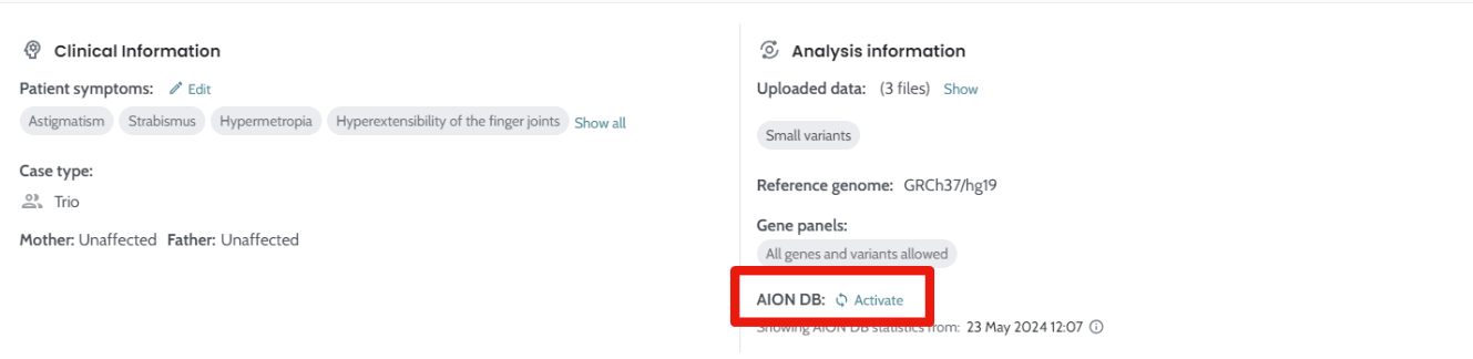 Case 2 is a patient affected by neurodevelopmental delay. A variant in KIF1A was prioritized in rank #1, not only due to phenotype matching between the patient and the candidate disease, but also due to AION’s ML score prediction of pathogenicity (91%). After performing variant segregation in the parents, this variant was shown to be de novo (absent from the parents), thus confirming its pathogenicity. Interestingly, this variant was later annotated as Likely Pathogenic in ClinVar due to description in other patients. This case illustrates how AION machine learning algorithms can perform correct predictions of pathogenicity in cases where the variant has not been previously described in databases!