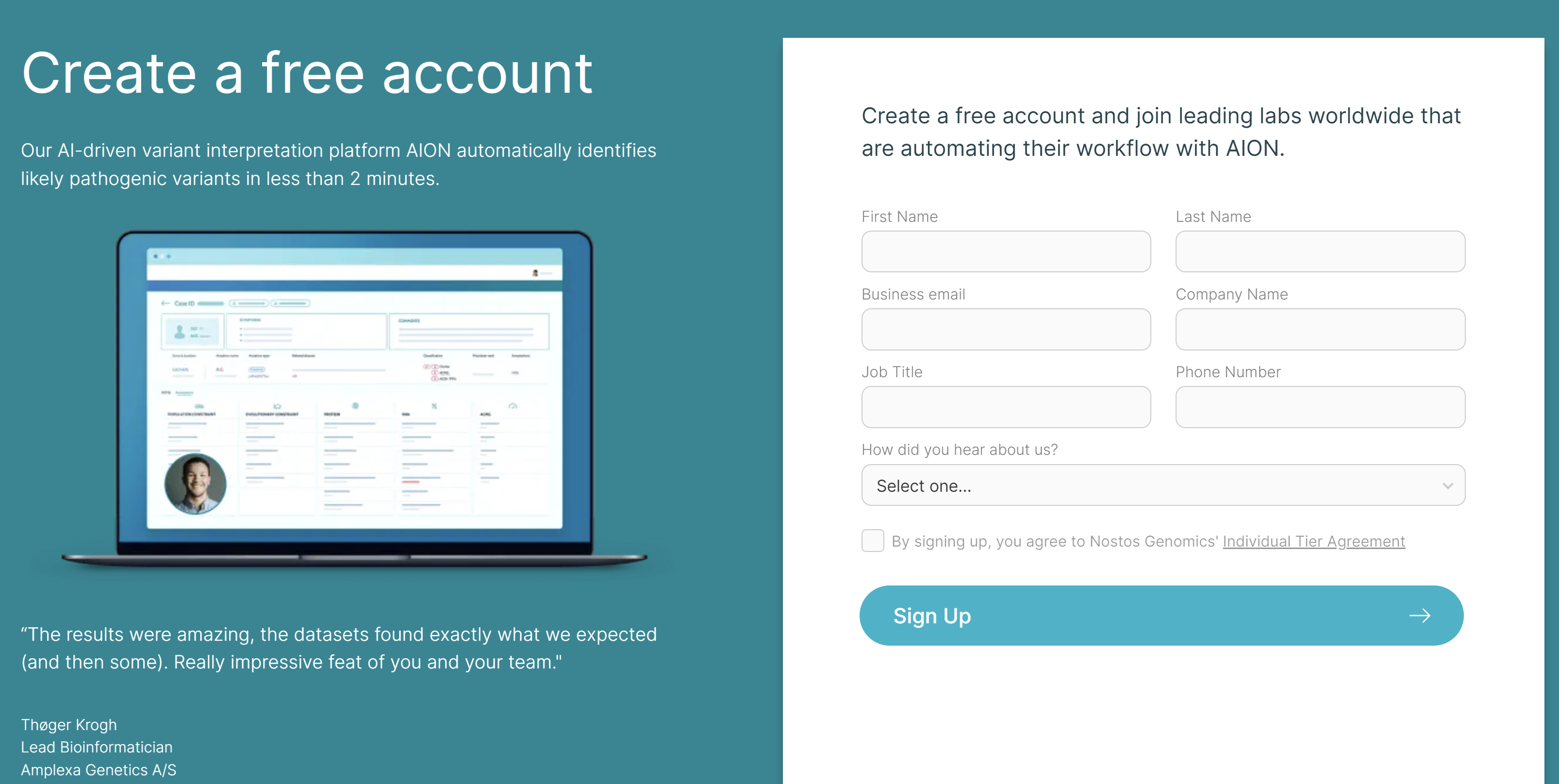 Simply provide your name and last name, as well as a valid company email address (free email services are not allowed) and after approval you will receive an email invitation to AION variant interpretation platform. Follow the instructions and you will have an account to test the future of variant interpretation.